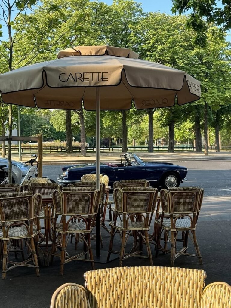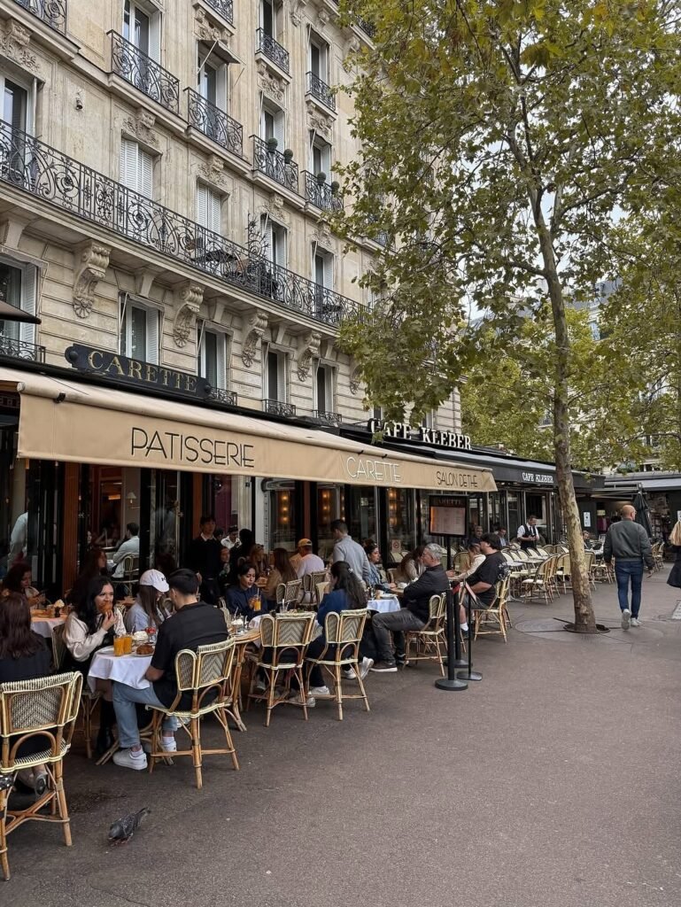 The seating setup is classic Paris: small round tables, wicker chairs, and rhythm of waiters weaving with trays of croissants, coffees, and cups of Carette hot chocolate.