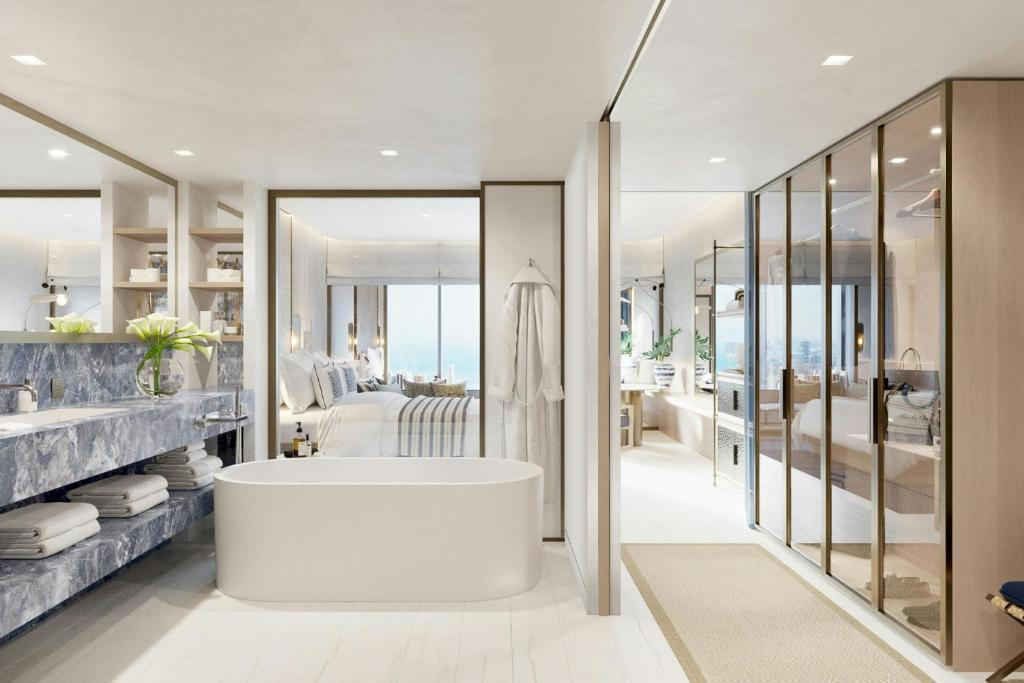 Bathrooms feature rainfall showers, separate soaking tubs (in most categories), quality fixtures, heated towel racks, and ample counter space. The marble finishes feel luxurious without being cold.