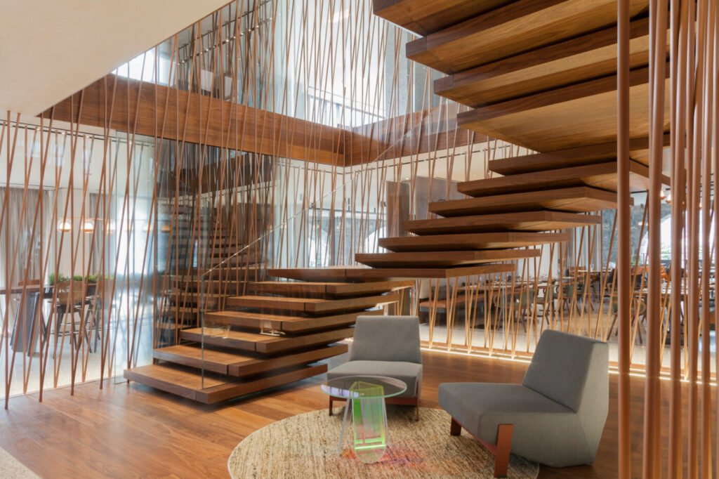 The dining room positioning—with sculptural staircase descending from main lobby to restaurant level—creates theatrical entrance experience, acknowledging dining as ceremony rather than mere fuel consumption. Floor-to-ceiling windows frame lake views during meal service, making landscape itself a dining companion.